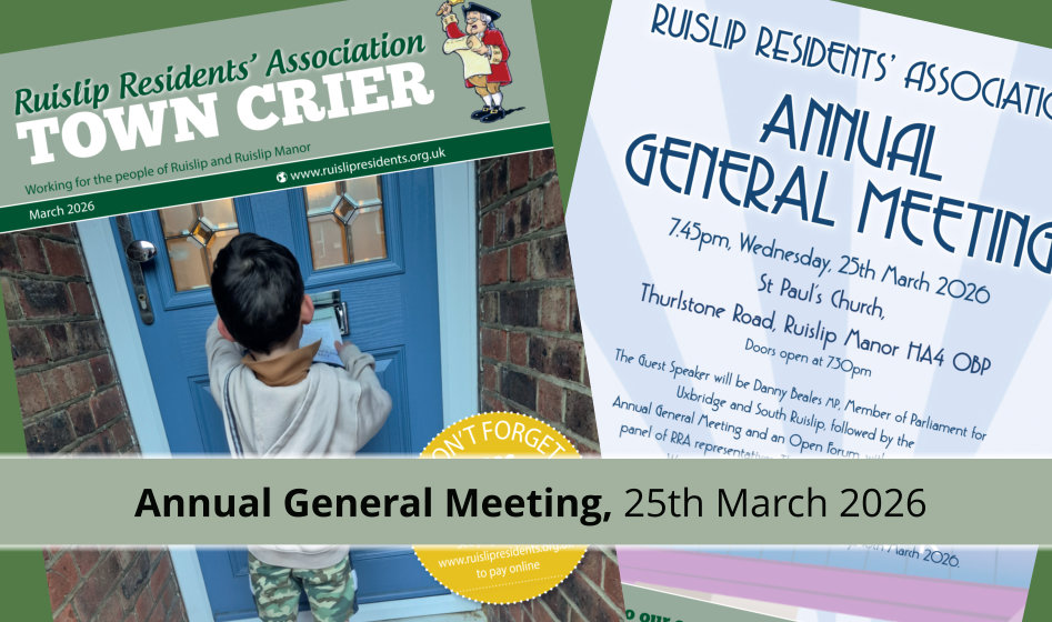 Ruislip Residents’ Association has two public meetings per year. We have our AGM in the spring and a General Meeting in the autumn. There is a copy of the Town Crier magazine delivered to every house in Ruislip and Ruislip Manor in the few weeks before each meeting. (If you have not yet received your copy of the Town Crier, please let us know)