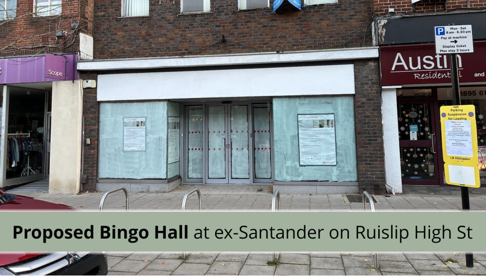 An application has been submitted for 73 High Street, Ruislip—the site of the former Santander bank—to change its use from a bank to a “sui generis (bingo hall)”. The application also includes plans to create a new, separate doorway to provide direct access to the upper floors.