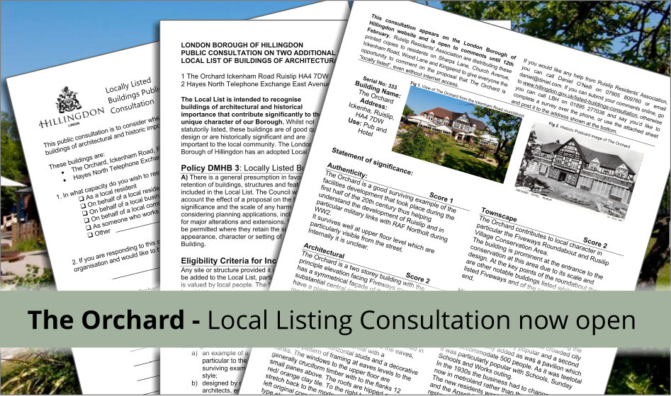 Ruislip Residents’ Association are distributing printed copies of the consultation (both the Eligibility Criteria for Inclusion in the Local List and LBH’s own Statement of Significance) to residents on Sharps Lane, Church Avenue, Ickenham Road, Wood Lane and Kingsend to give everyone the opportunity to comment on the proposal that The Orchard is “locally listed”, even without internet access.